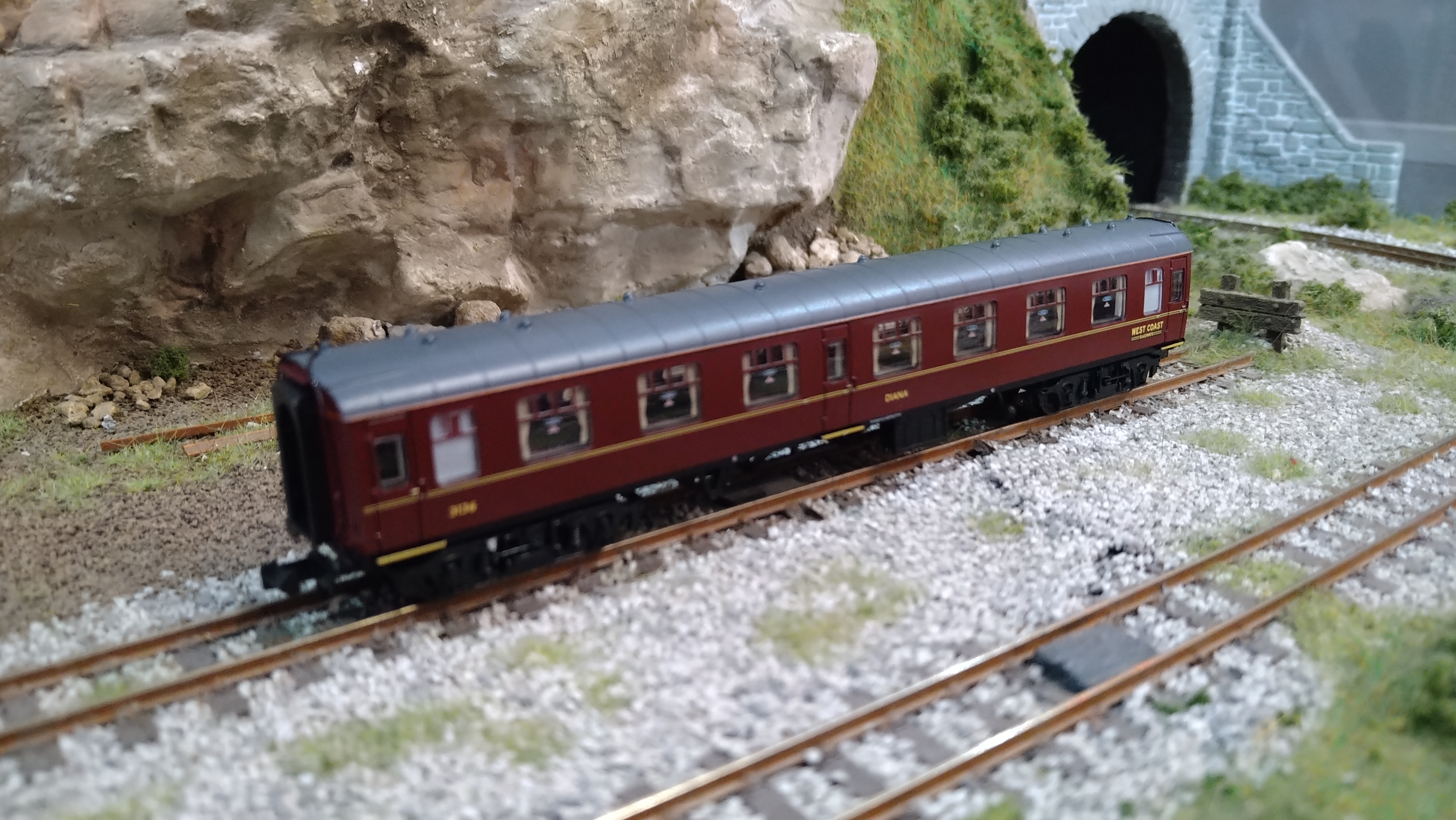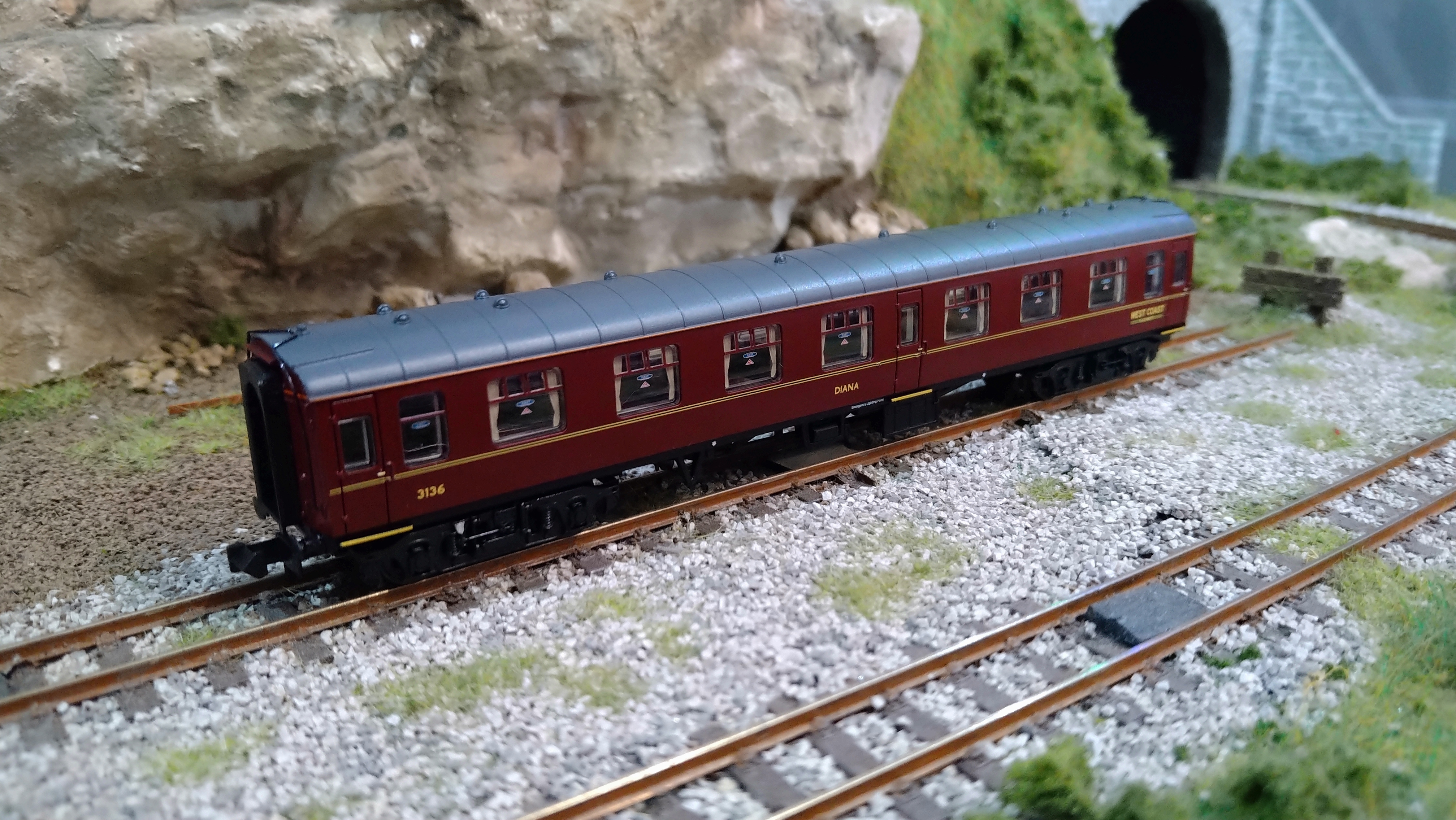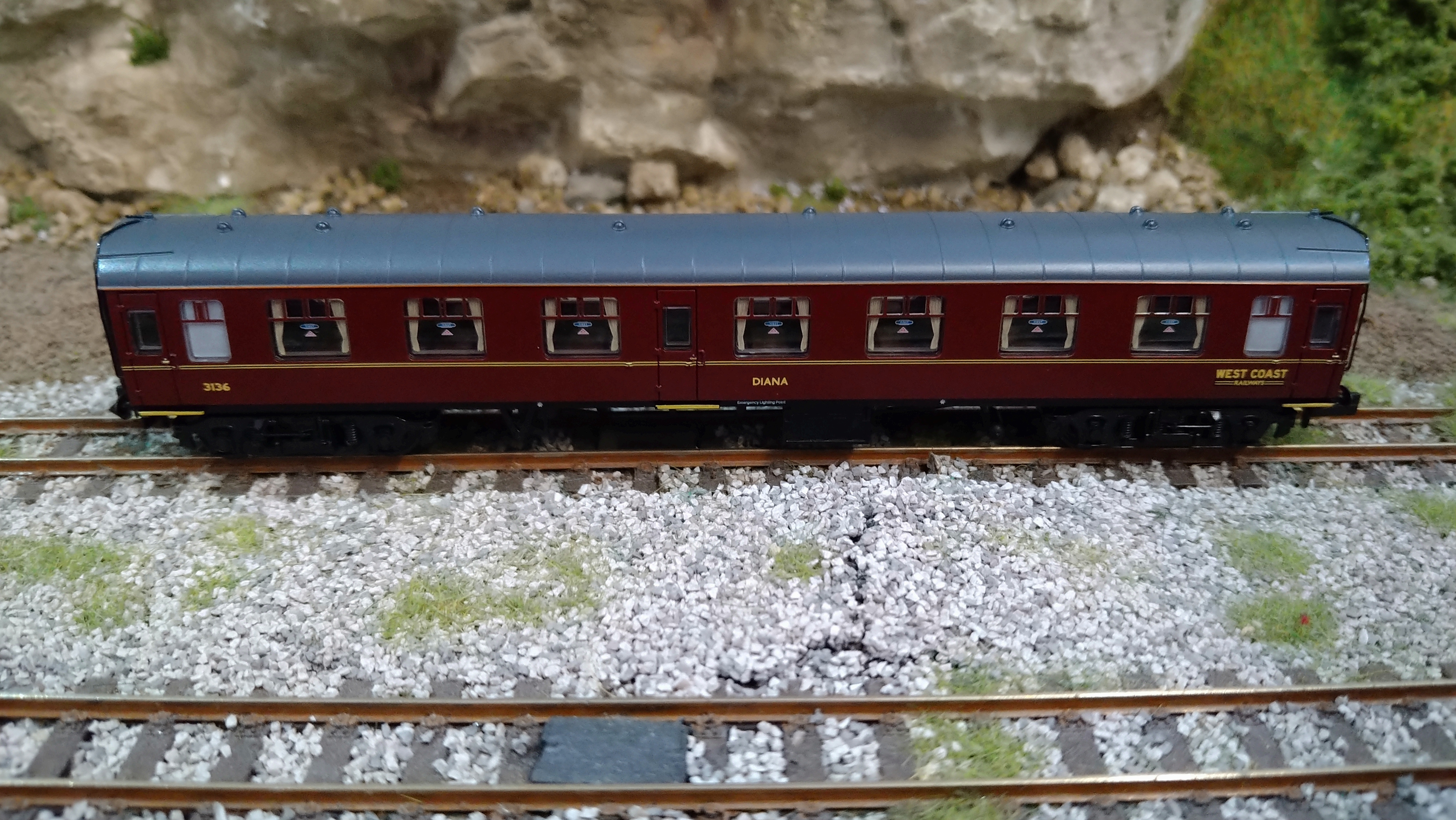 374-821 GRAHAM FARISH WCRC WEST COAST RAILWAY COMPANY MK1 FO FIRST OPEN COACH ‘DIANA’ MAROON 3134