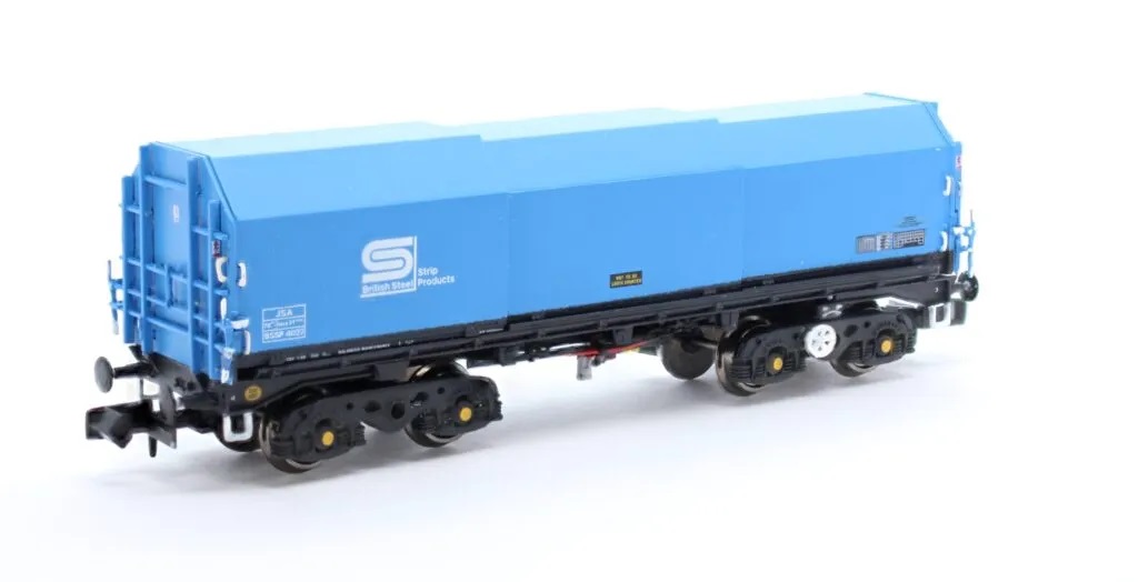JSA coil carriers – British Steel blue (twin pack A). Twin pack of different numbered wagons: BSSP4027 and BSSP4037